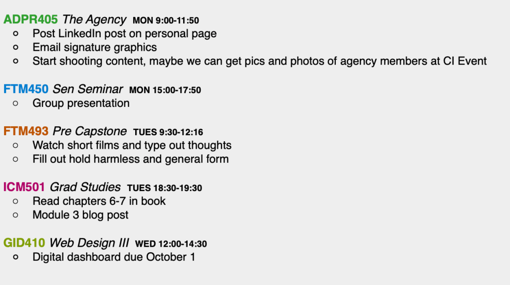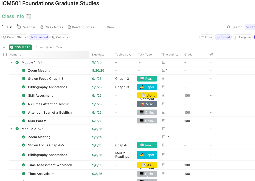 I realized the issue had more to do with how undetailed my notes were. There was no sense of priority, no deadlines, in fact, I often forgot to update most of my classes on a week-to-week basis. This meant I constantly lost time because I wasn’t sure what I had completed and what still needed to be done. Or even what I should tackle next.